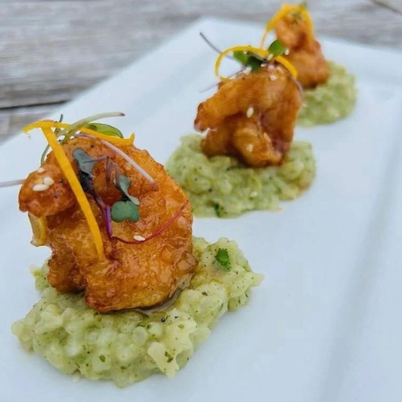 -Shrimp & grits jumbo shrimp, fried grit cake, poached egg, cajun sauce.